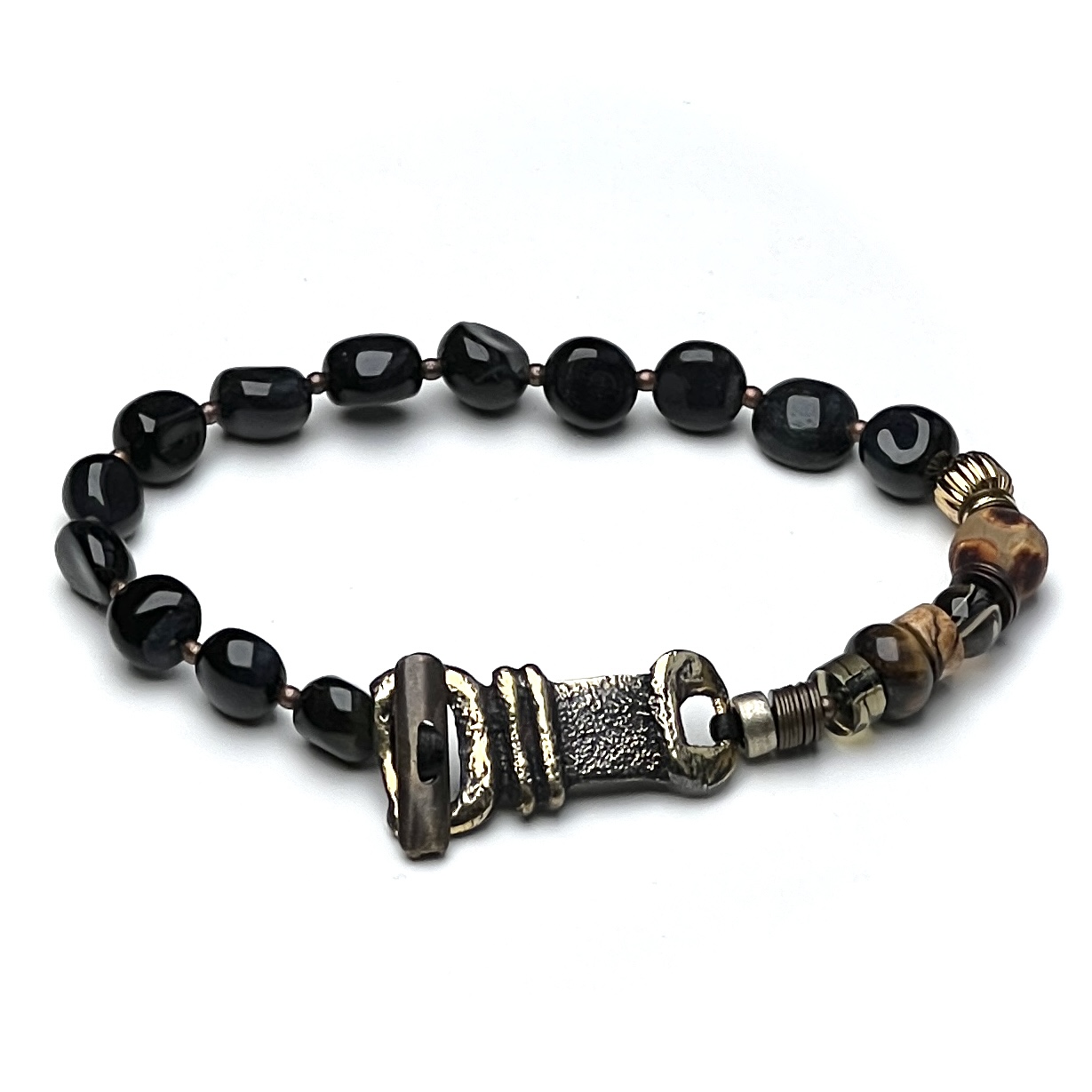 Antika bronz kemer kilit, siyah Turmalin, Smokey Quartz, Antik Akik, Jasper, 18k altın kaplama tohum kullanılarak tasarlandı.