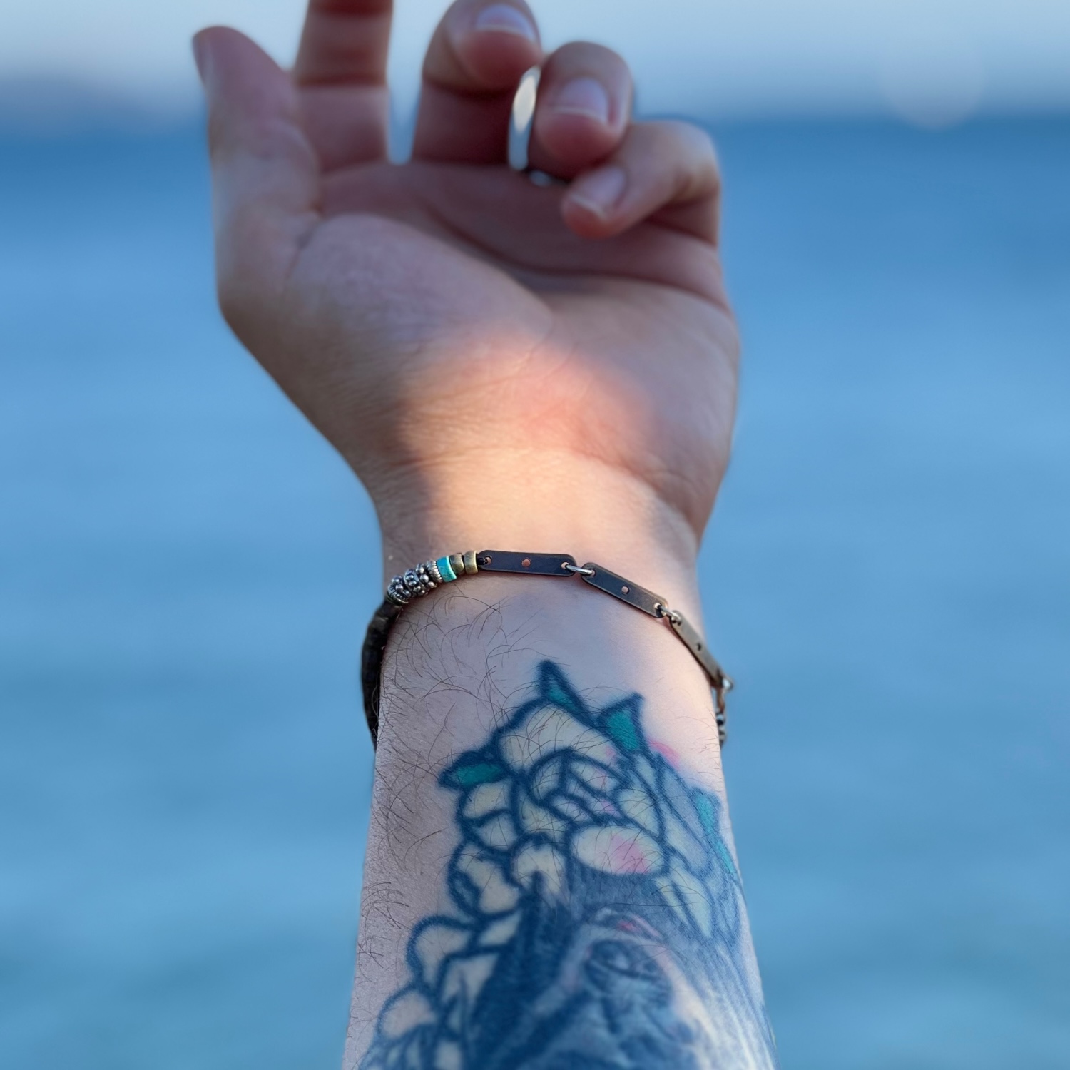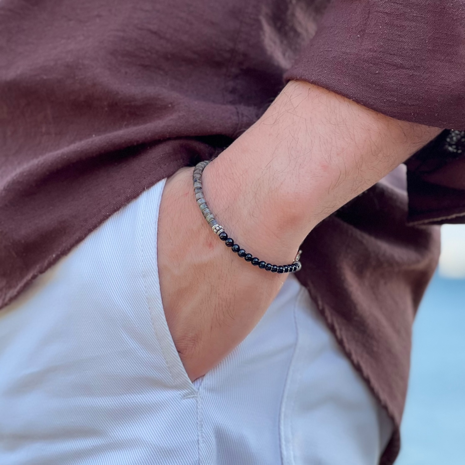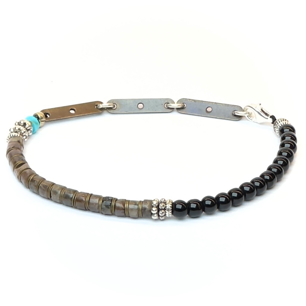 Akik (Siyah-Vizon) , gümüş, bronz ve turkuaz kullanılarak tasarlandı.