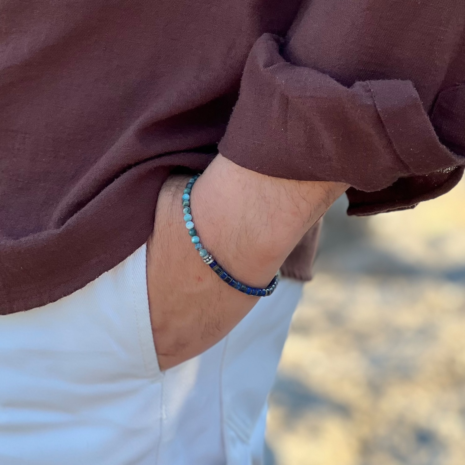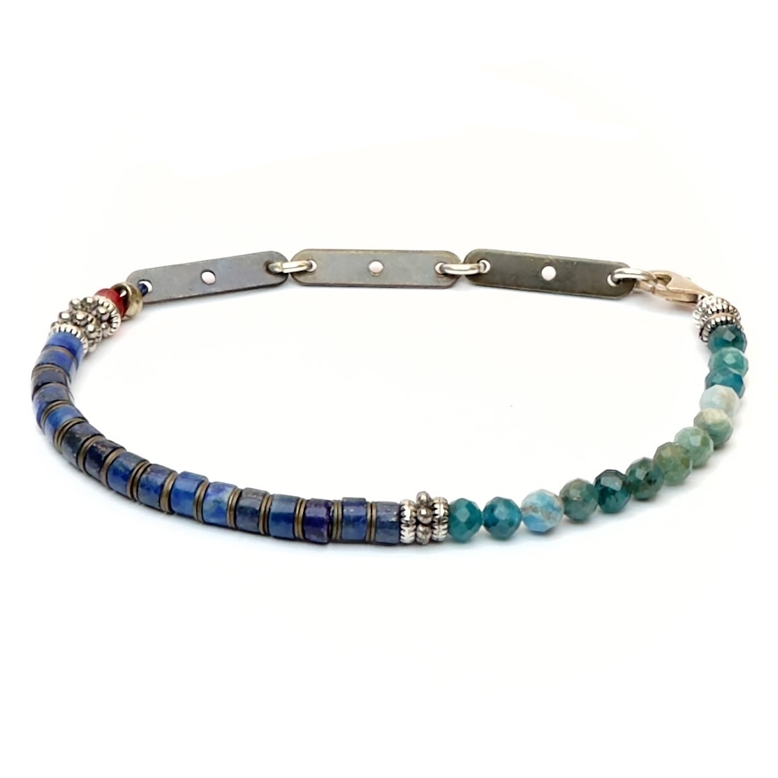 Aquamarin, Lapis Lazuli, gümüş, bronz kullanılarak tasarlandı.