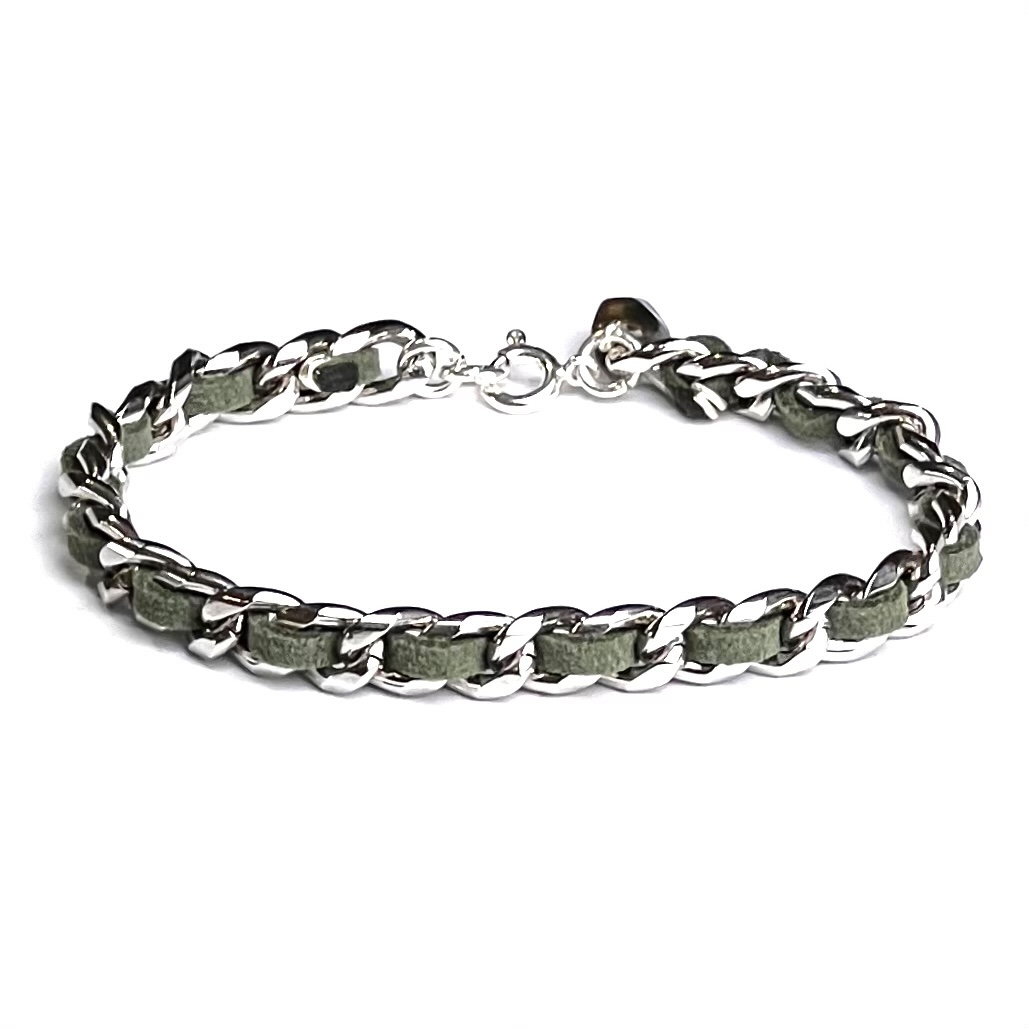 Çelik zincir, gümüş, obsidyen taşı ve yeşil deri kullanılarak tasarlandı.
