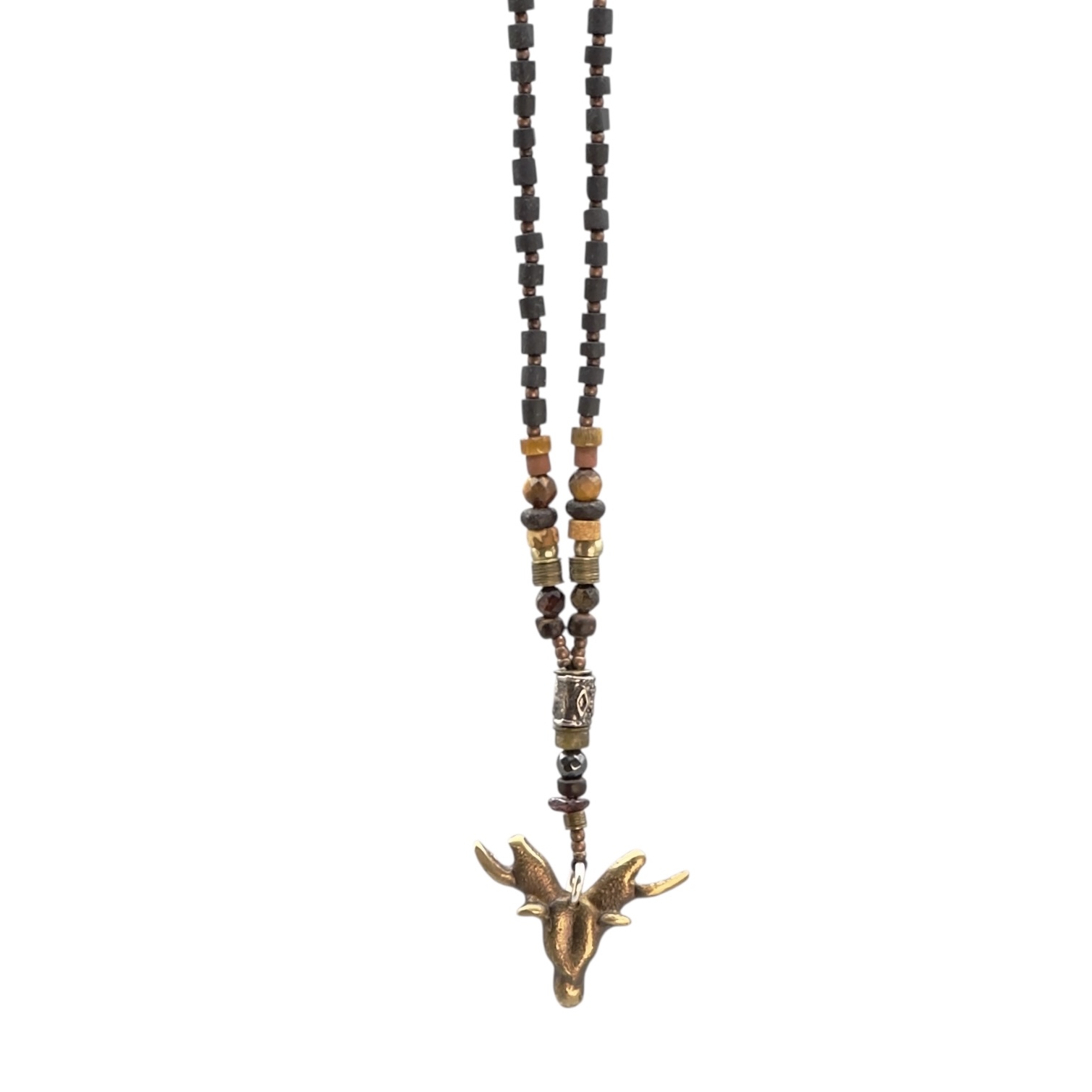 Onyx, sandalwood, tiger eye, bronz, pirinç, gümüş kullanılarak tasarlandı.