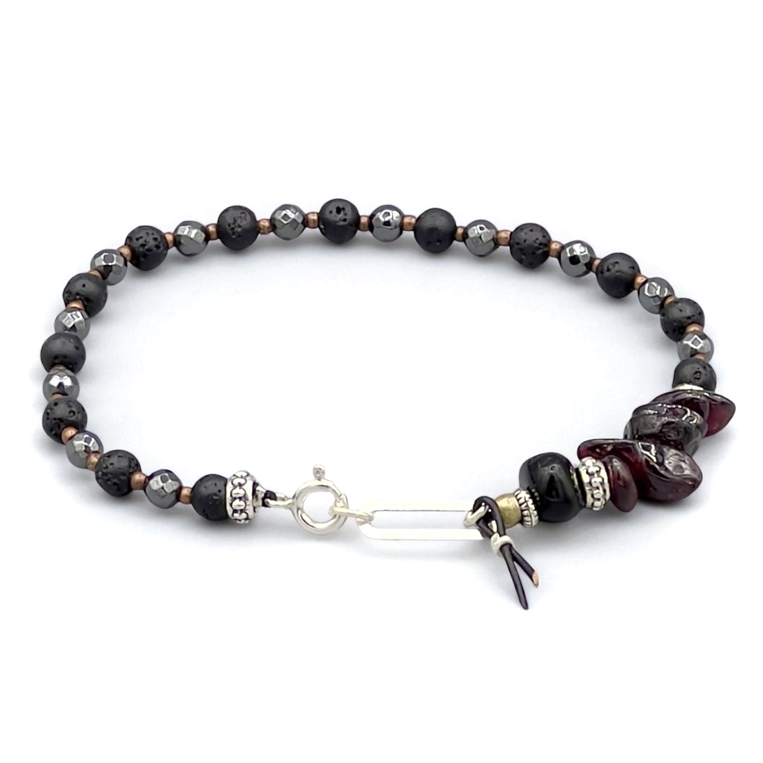Obsidyen, lav taşı, lal taşı, hematit, gümüş, deri kullanılarak tasarlandı.