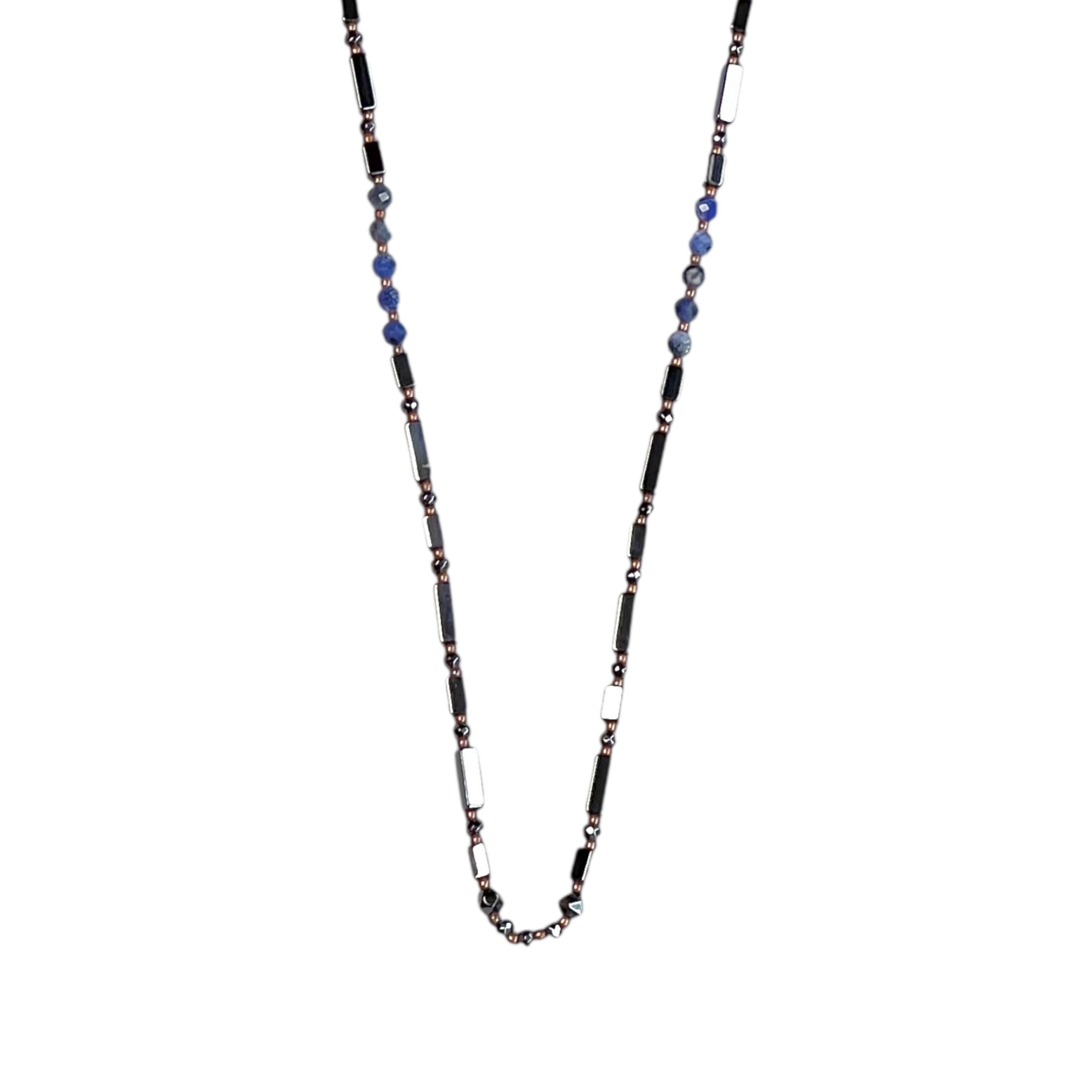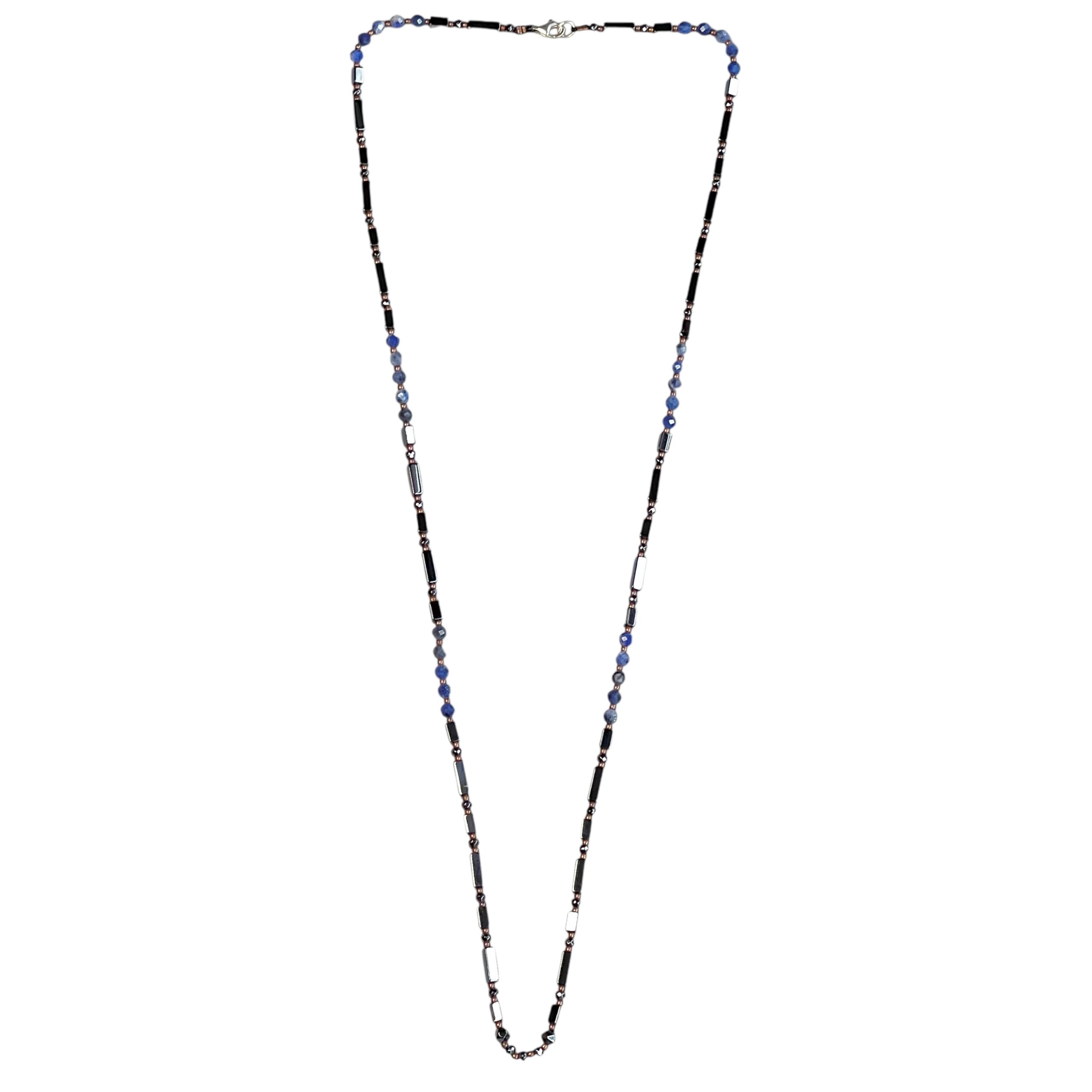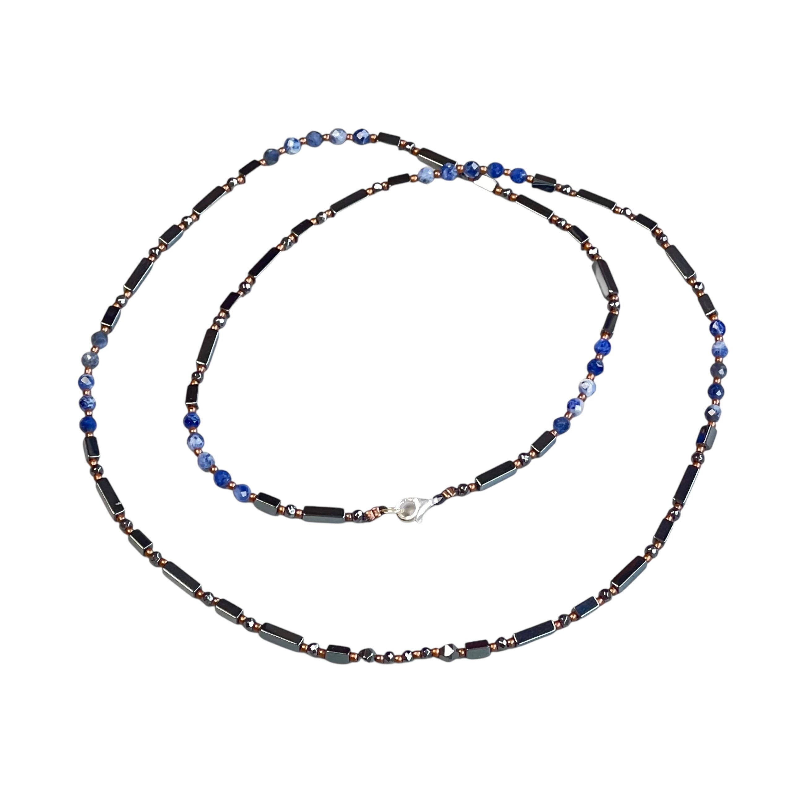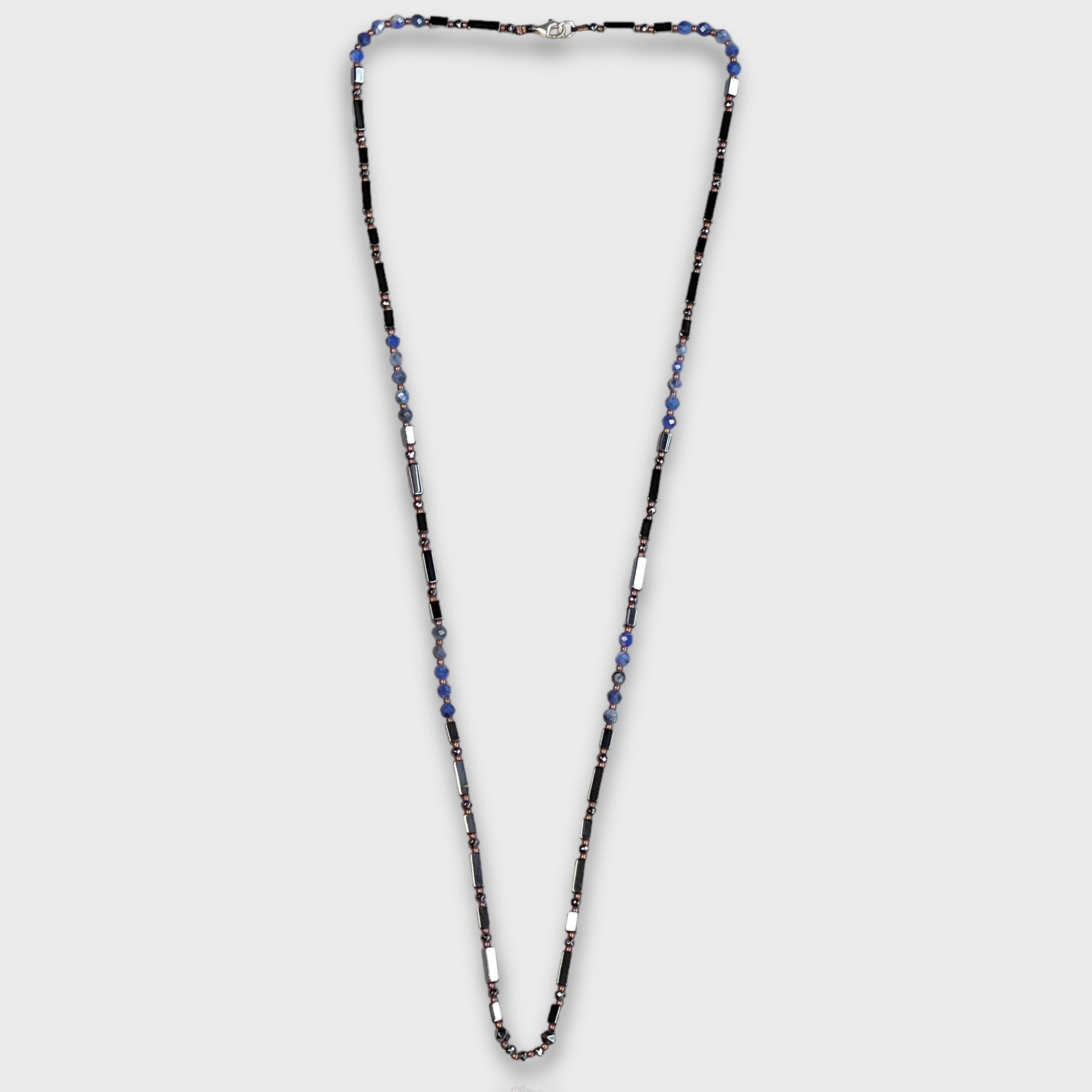 Jetblack Hematit, faset kesim Lapis Lazuli, gümüş ve bronz kullanılarak tasarlandı.