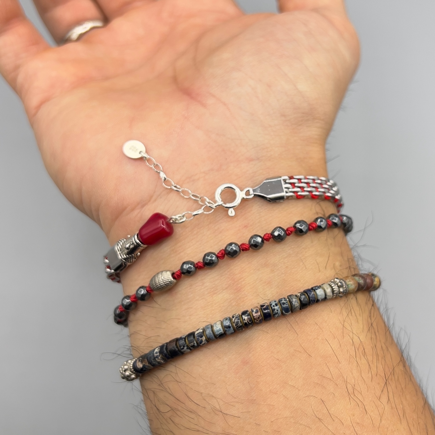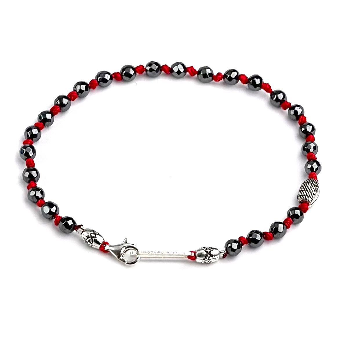 Jetblack Hematit, kırmızı ip, 925 gümüş kullanılarak tasarlandı.
