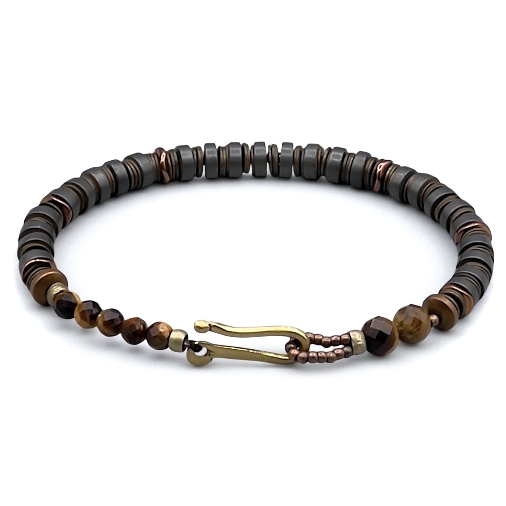 Hematit, bronz, tiger eye kullanılarak tasarlandı.