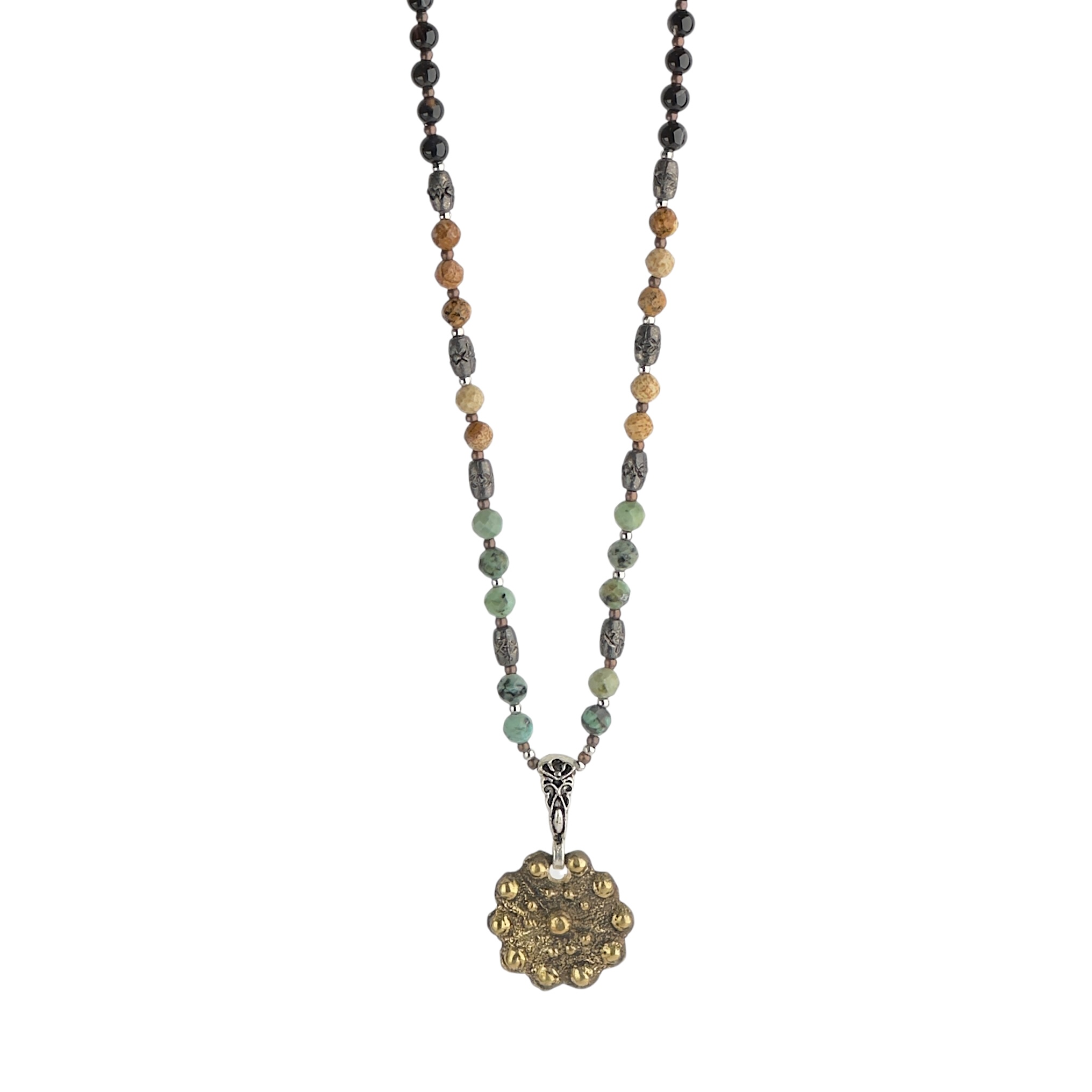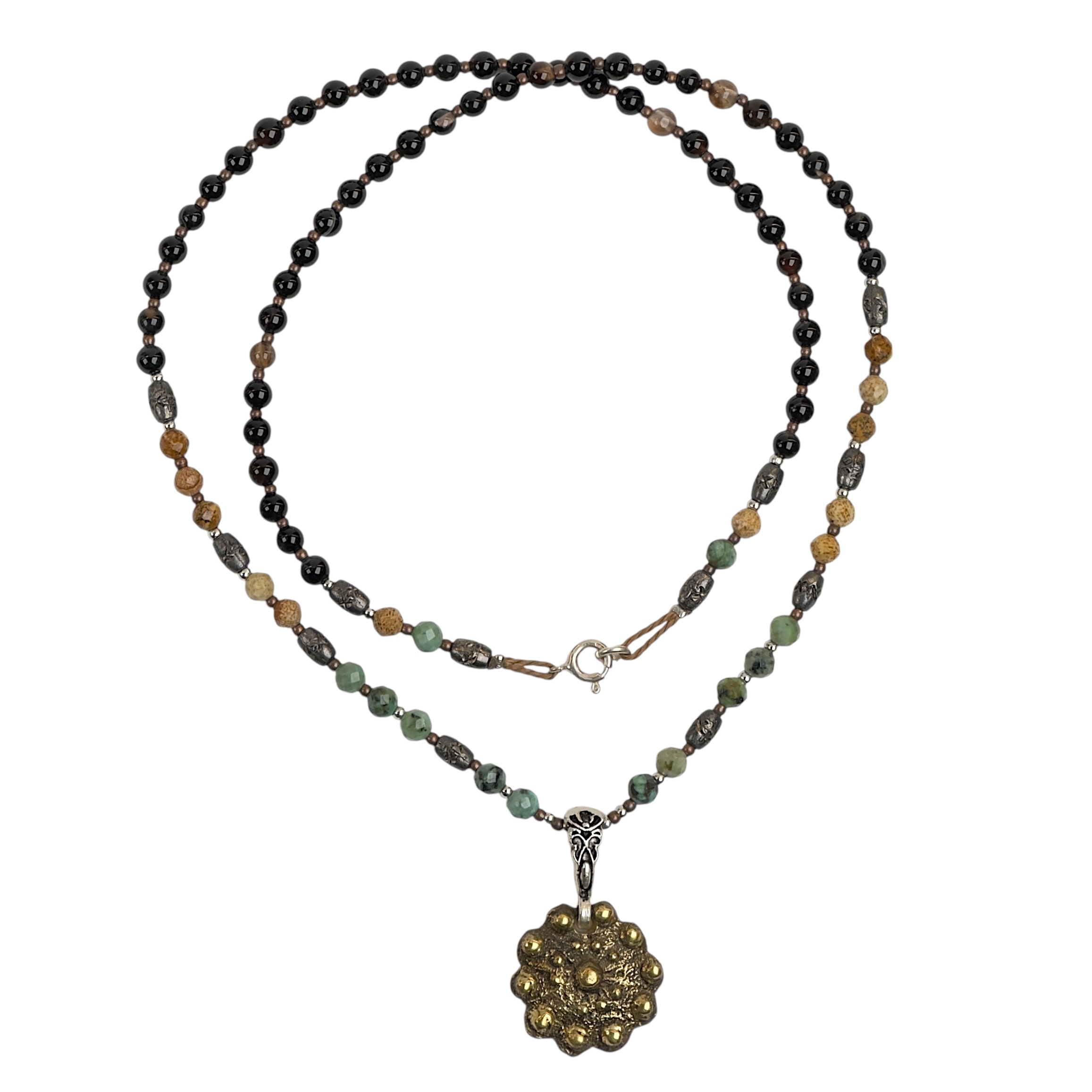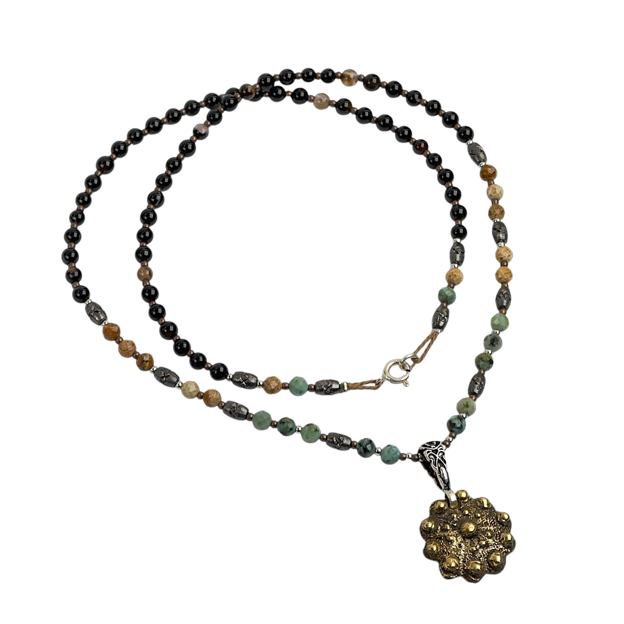 Malzeme & Ölçü Bilgisi; 5mm Siyah parlak akik, Faset kesim Afrika Turkuazı ve Jasper, pirinç, 925K Gümüş Uç çapı; 2,2 cm