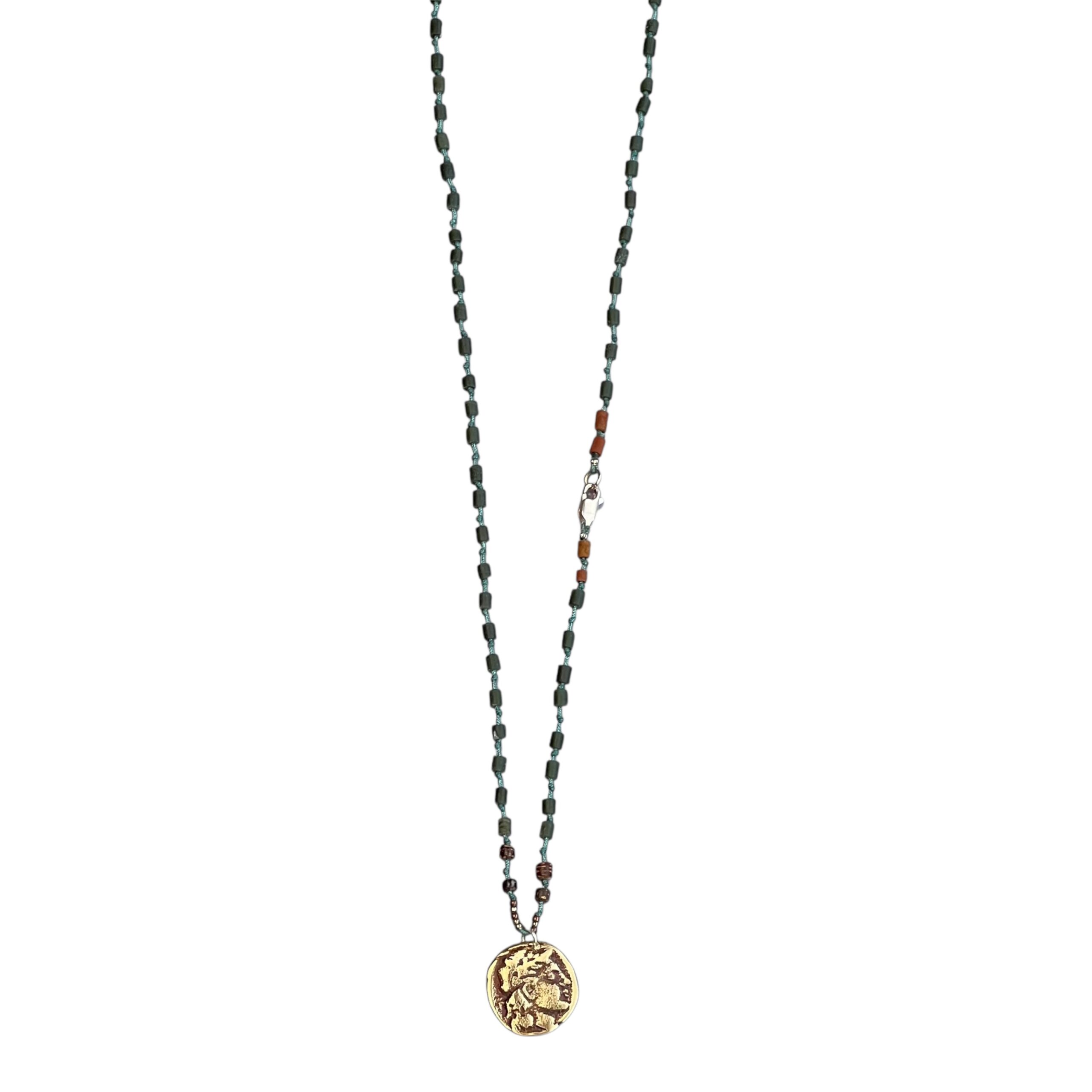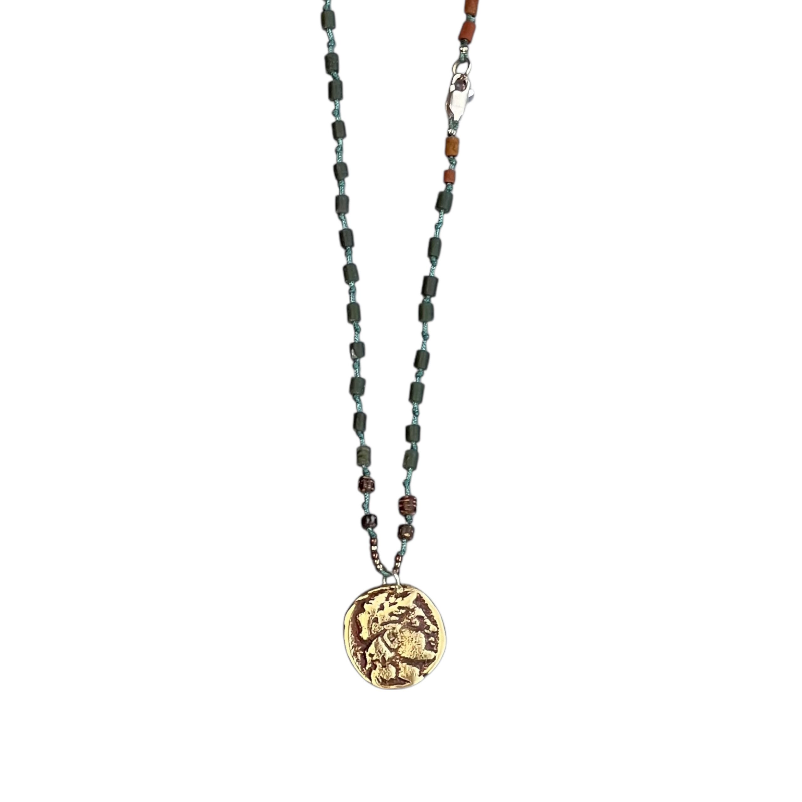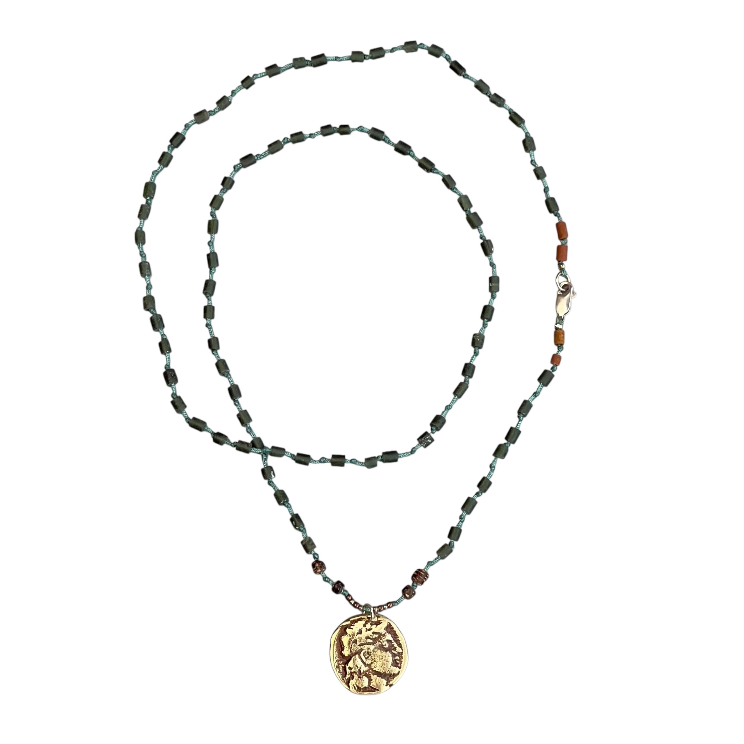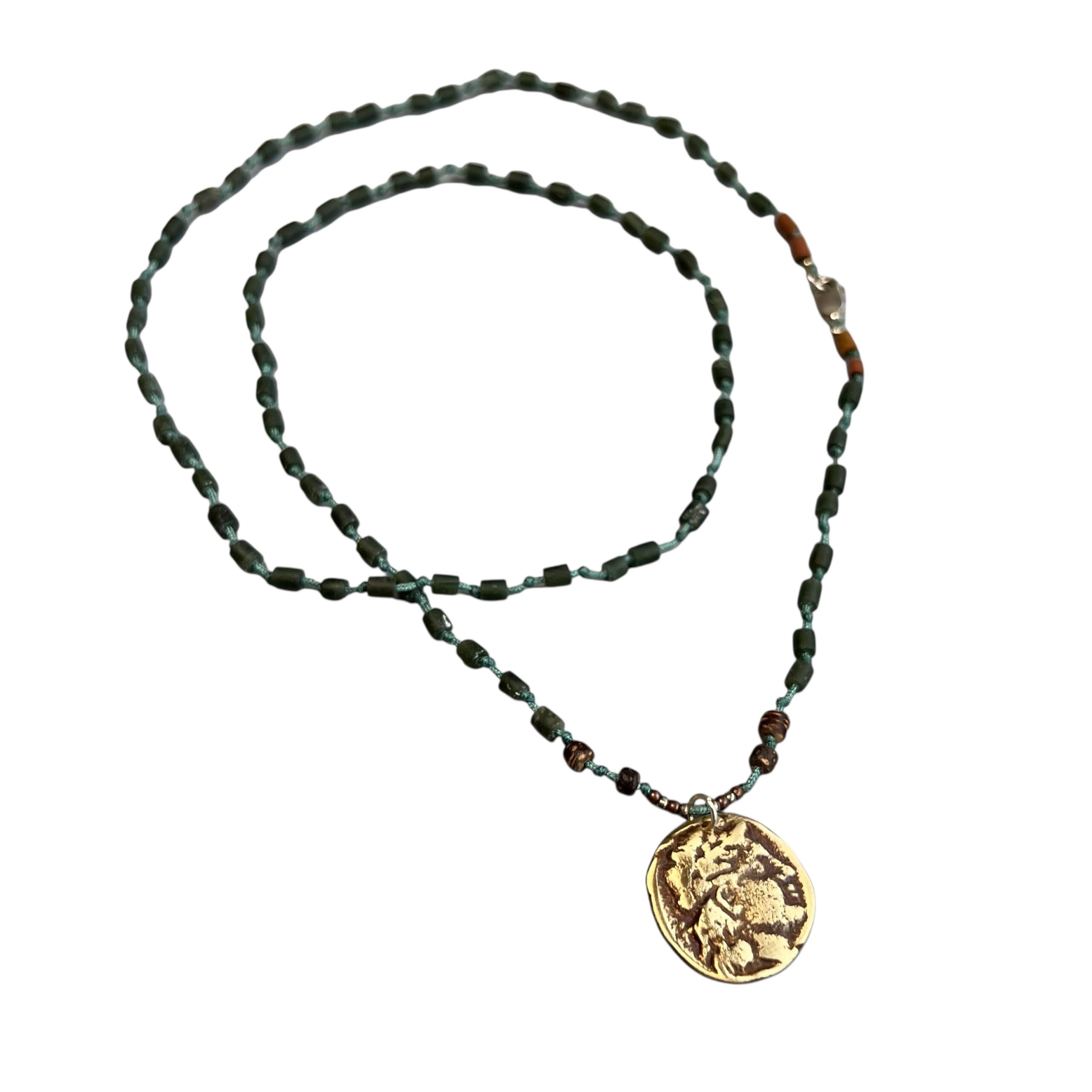 Jade, tigers eye, gümüş, bronz antika roma parası kullanılarak tasarlanmıştır.