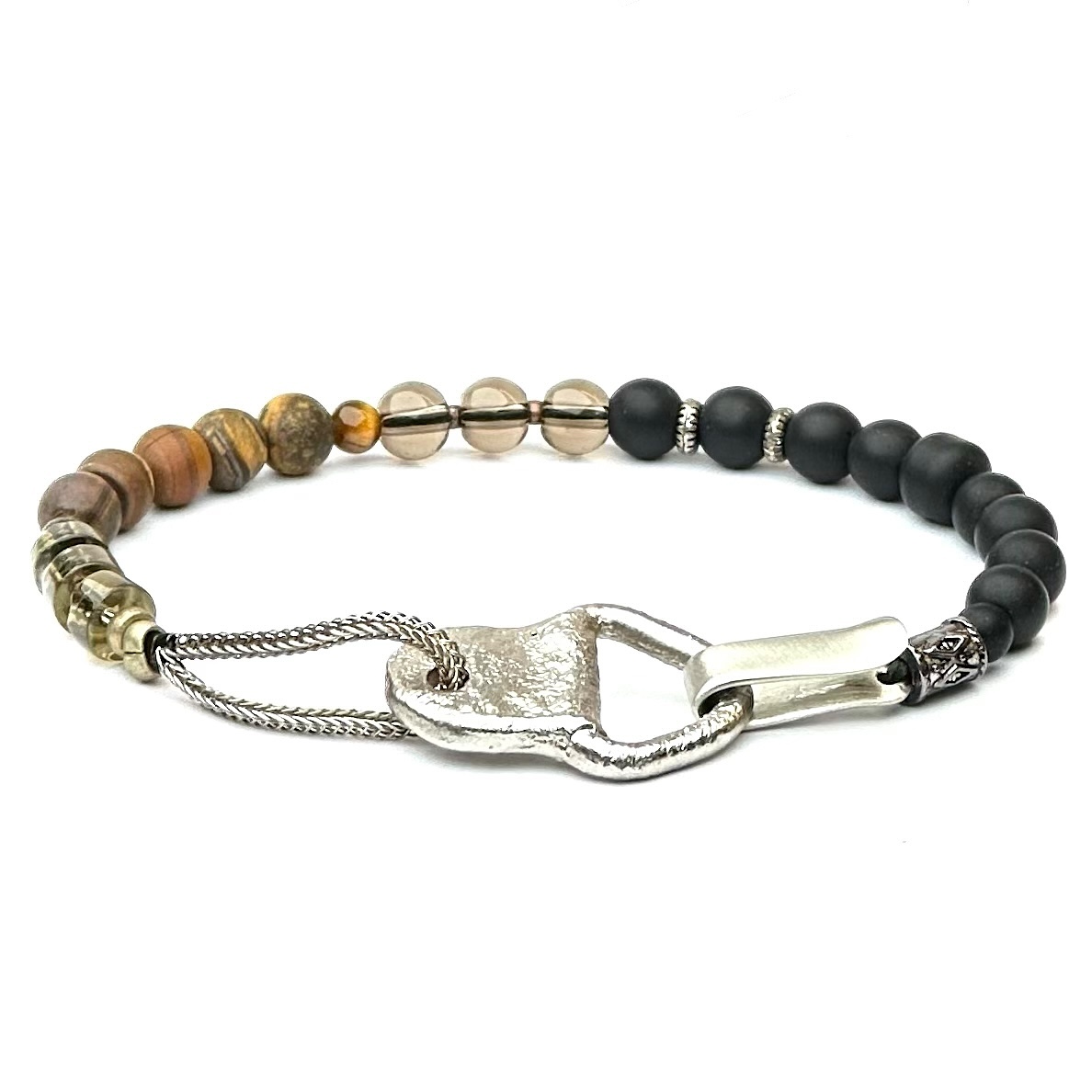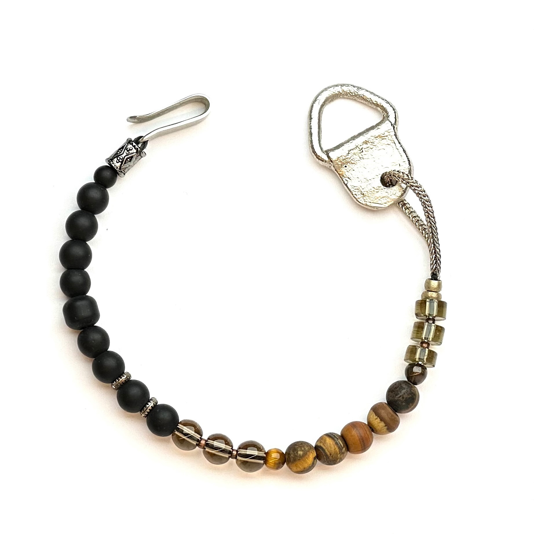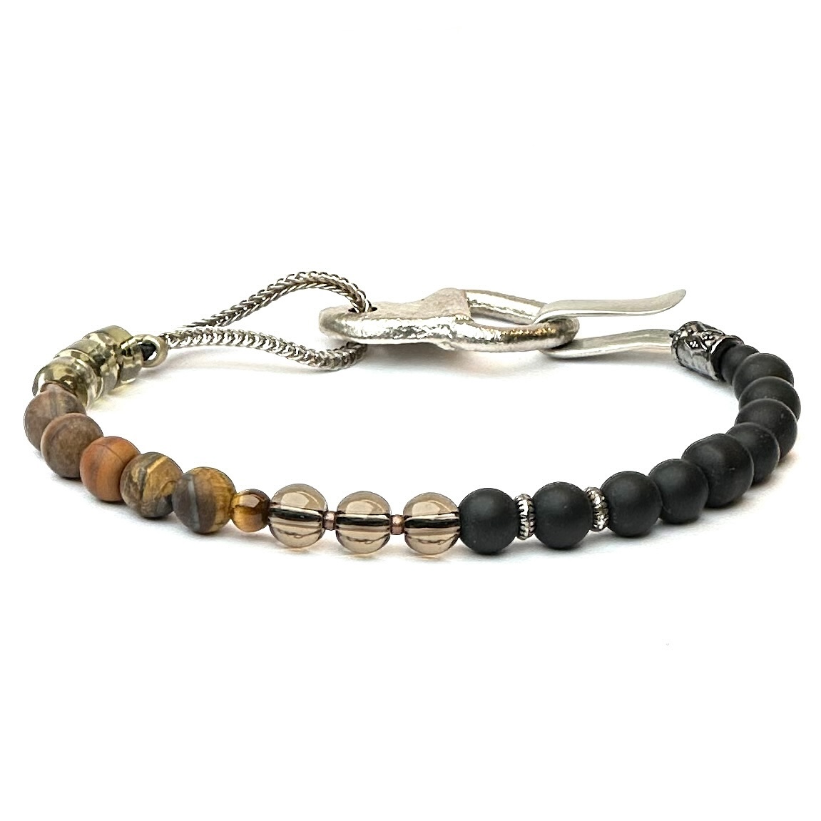 Smoke Quartz, Mat Tiger Eye, Onyx, Akik, Gümüş, Gümüş kaplama bronz kullanılarak tasarlanmıştır.