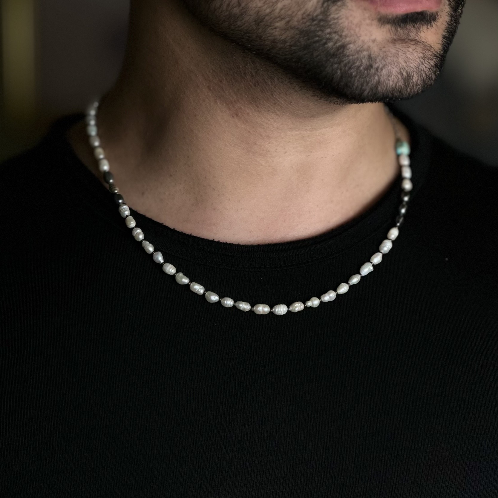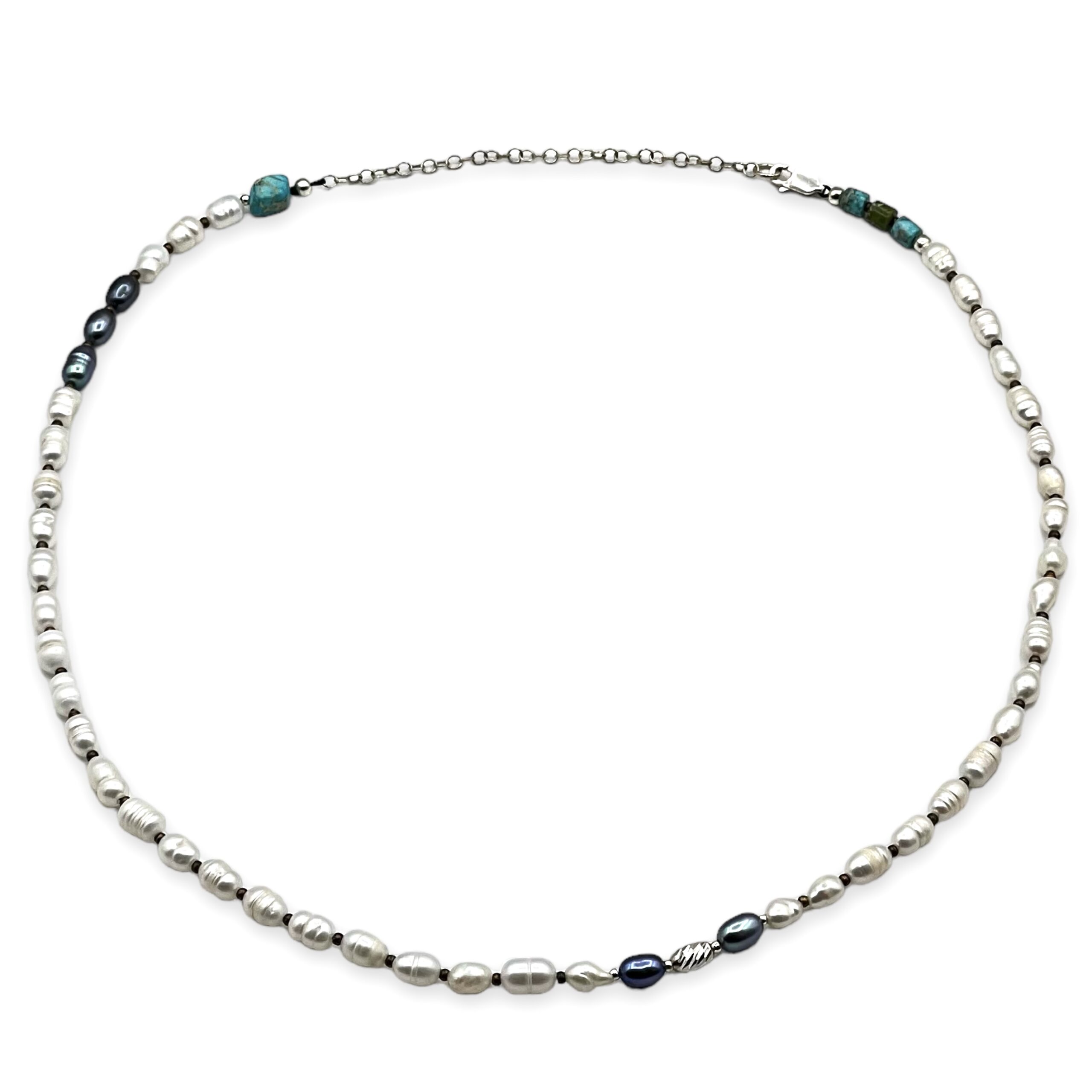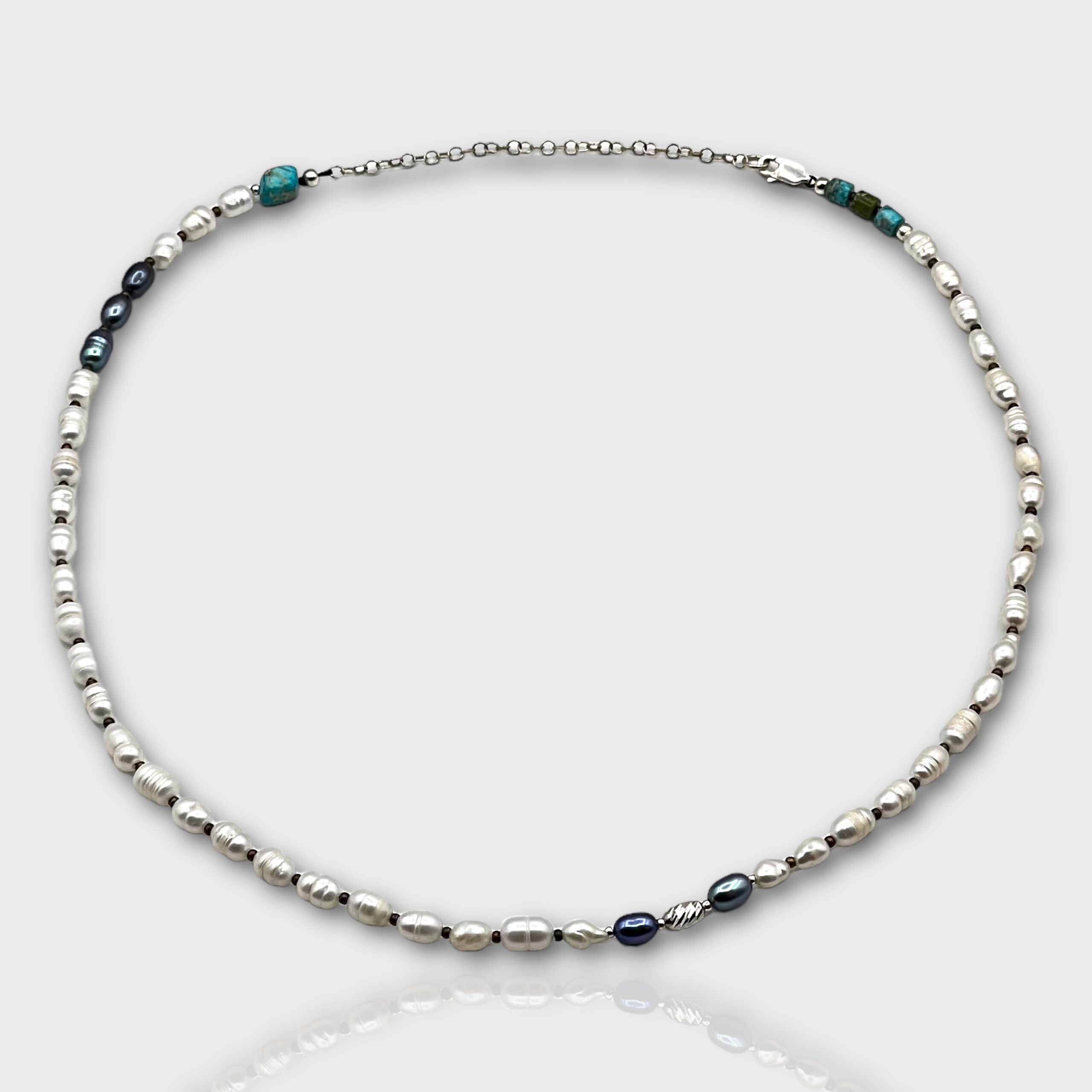 925K gümüş, siyah ve beyaz tatlı su incisi, firuze kullanılarak tasalandı.