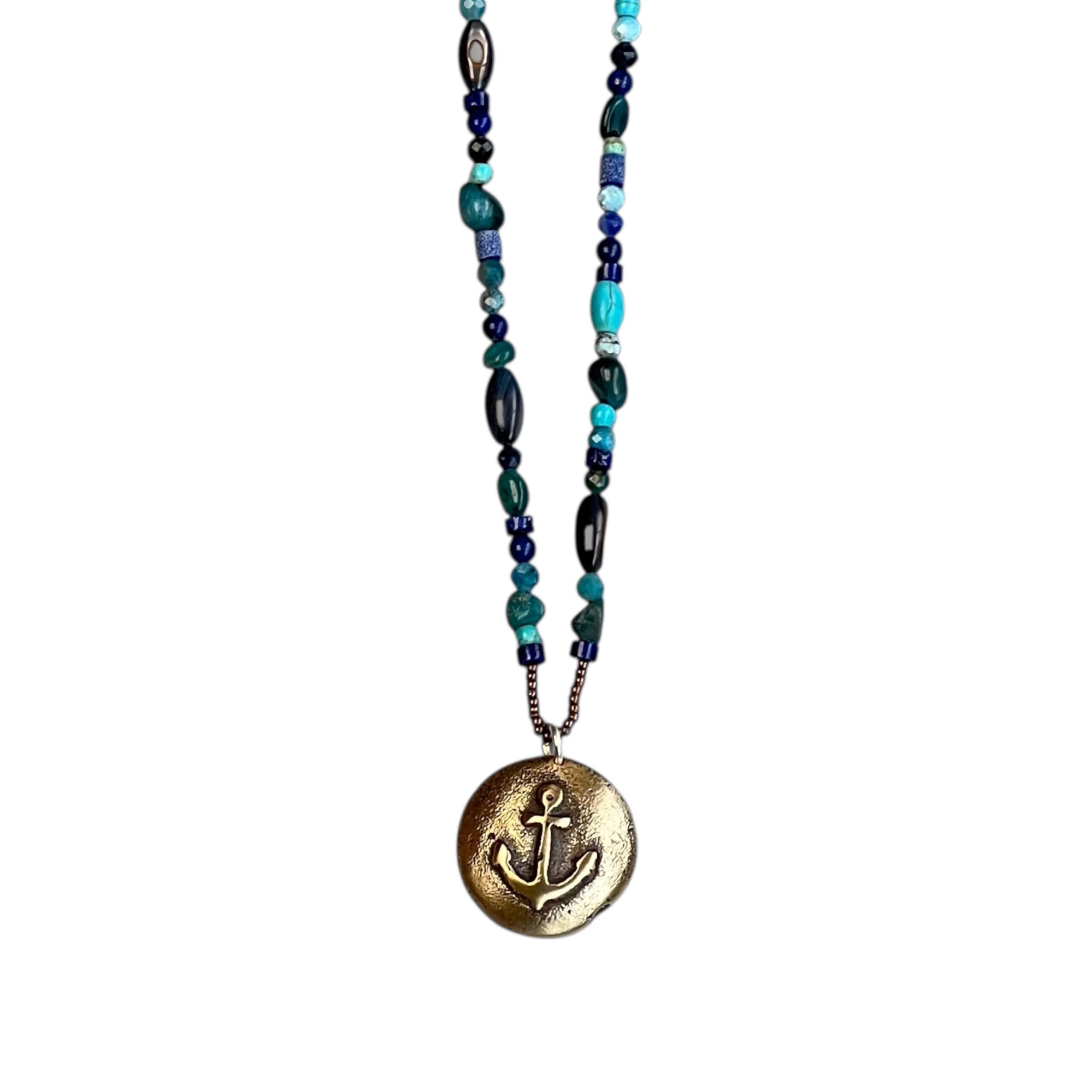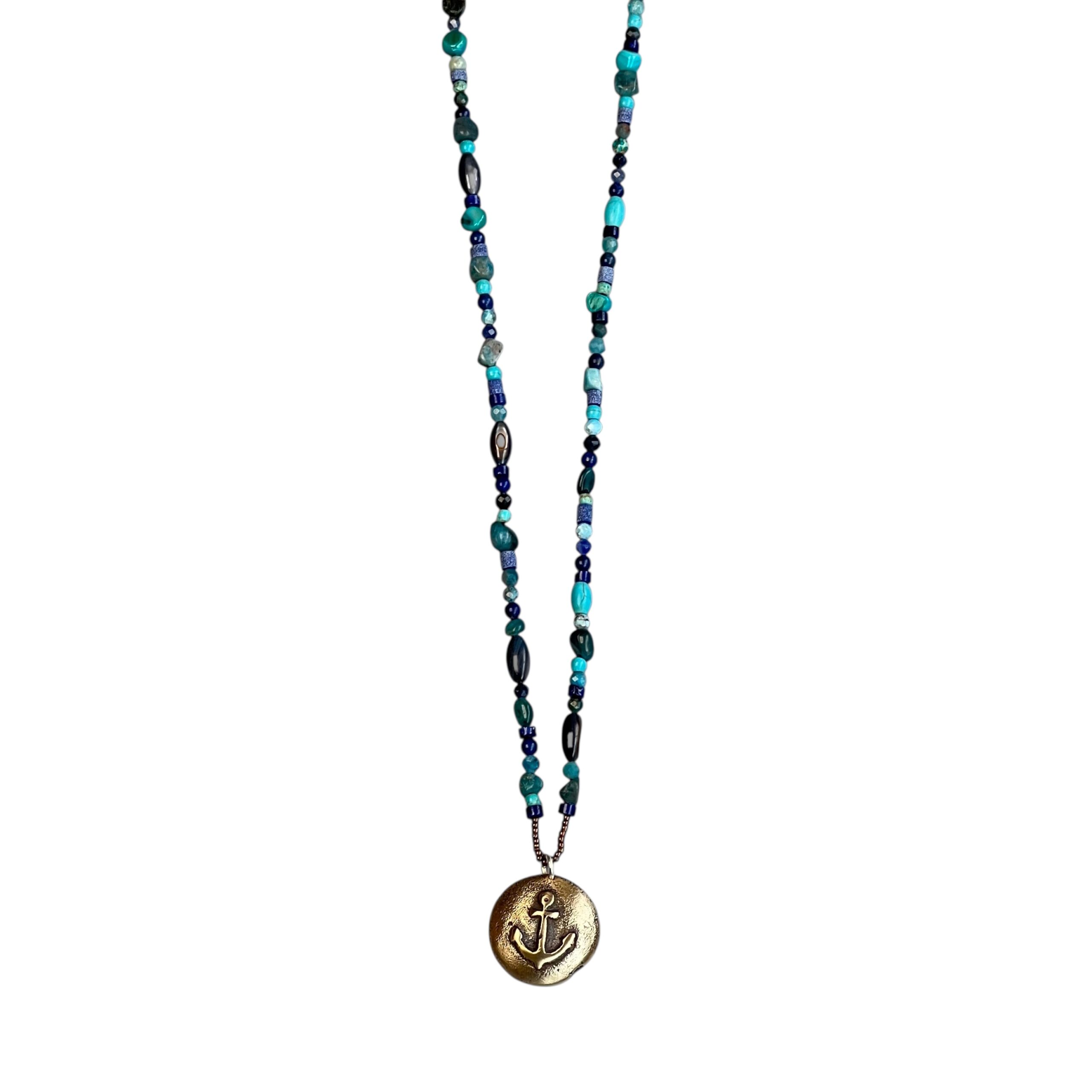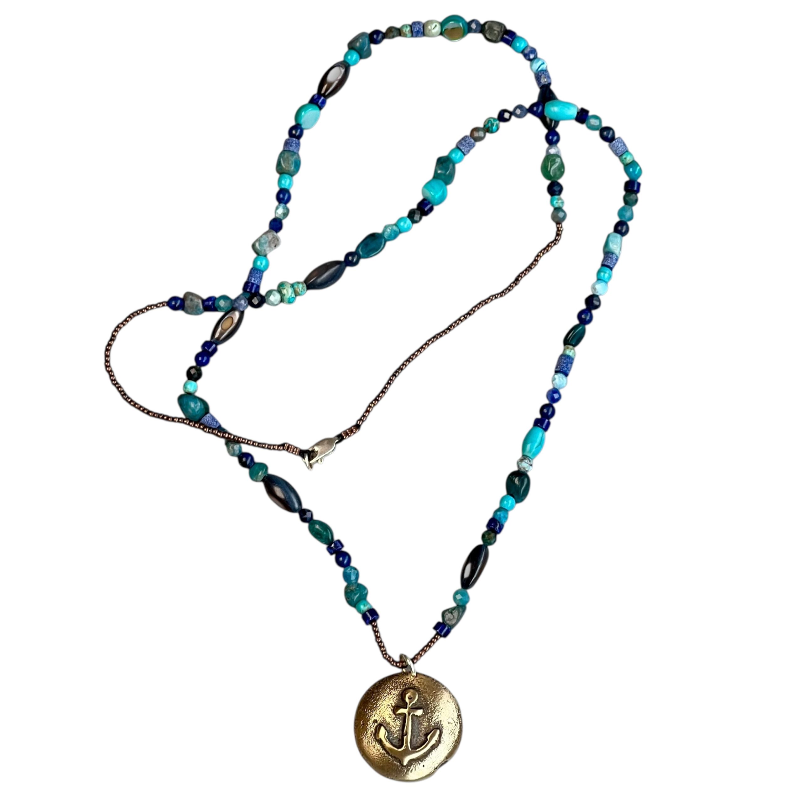 Aventurin, Lapis lazuli, Firuze, Aquamarin, Labradorit, bronz döküm antika çapa uç, gümüş kullanılarak tasarlandı.