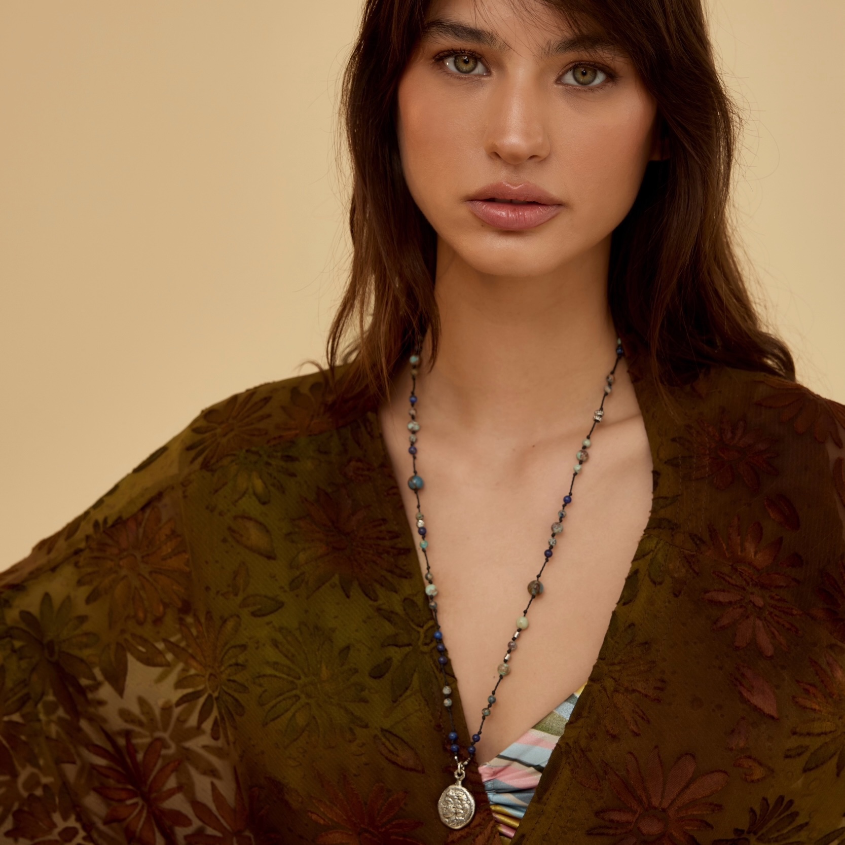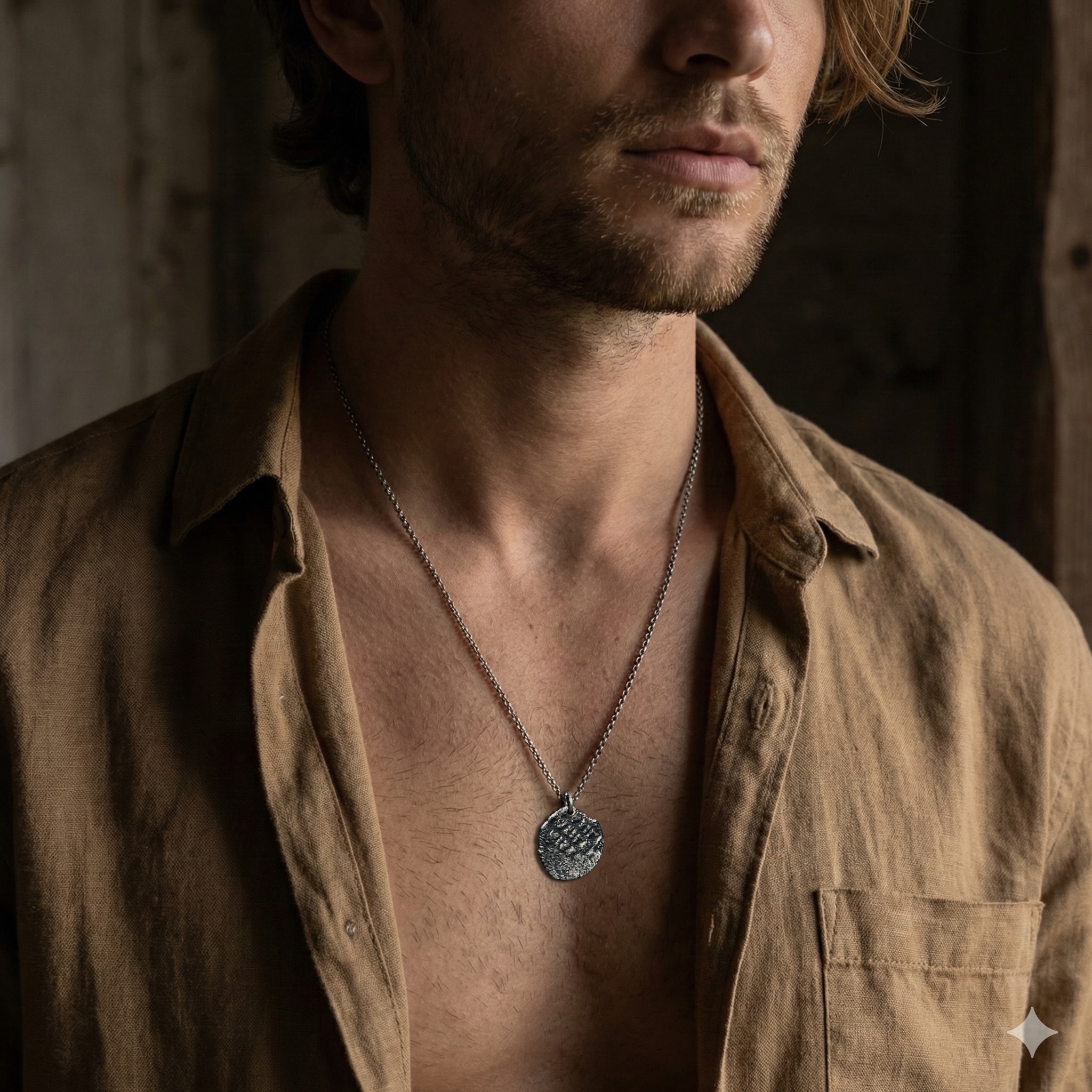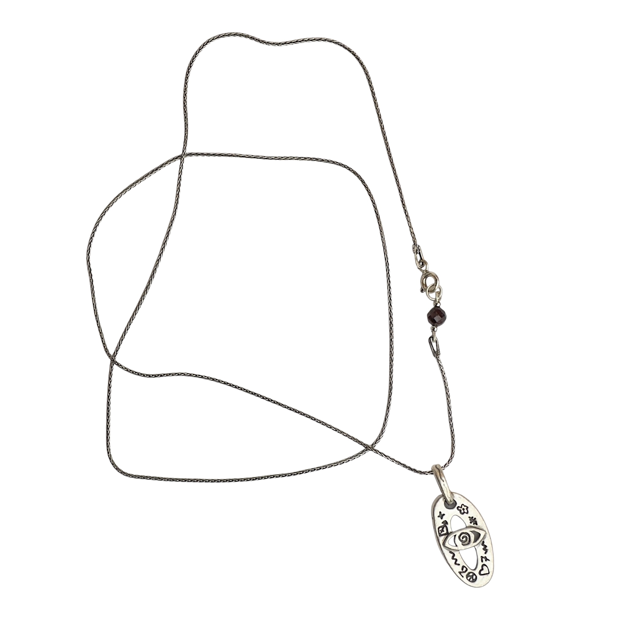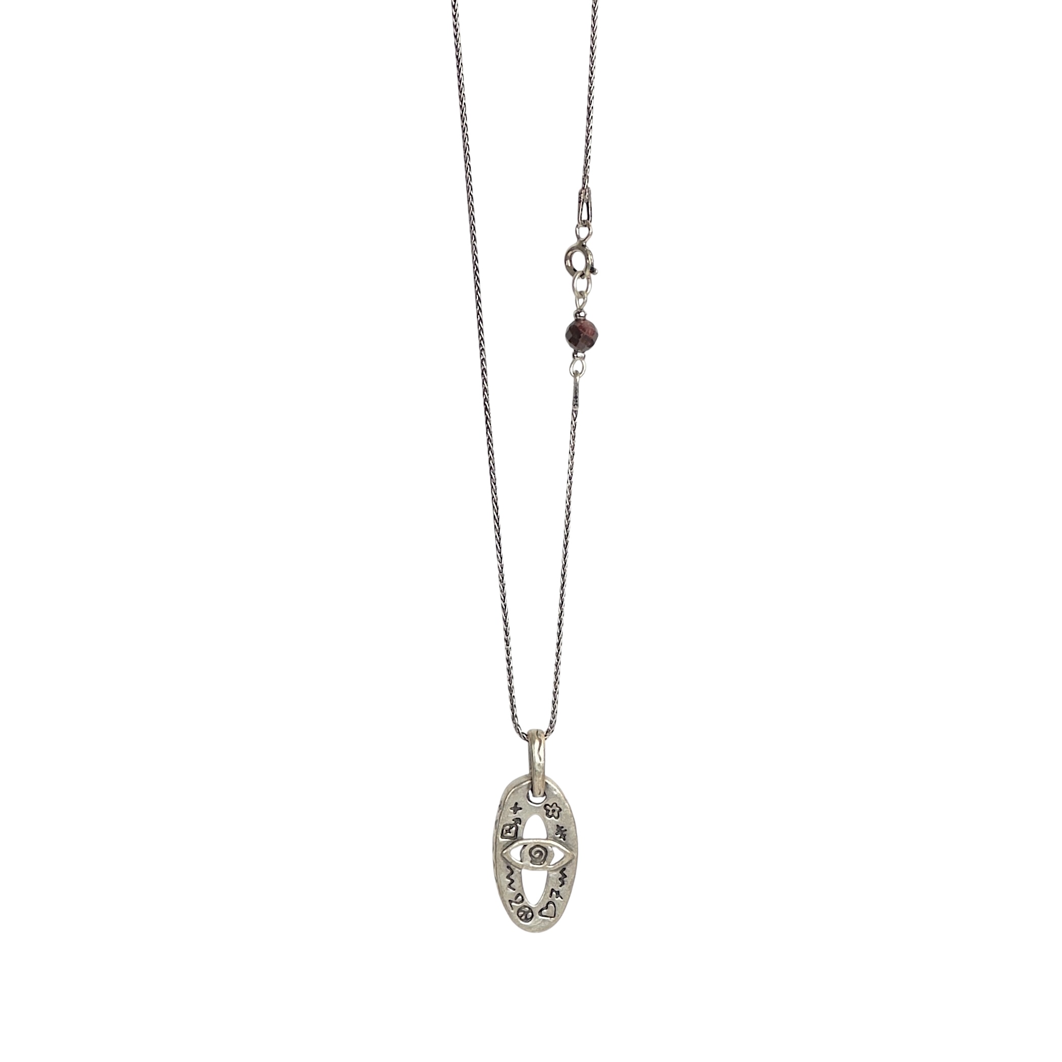 Zincir üzerindeki zarif taş (Kan Taşı) detayıyla tamamlanan bu tılsım kolye, sahibine şans getirmesi niyetiyle tasarlandı.