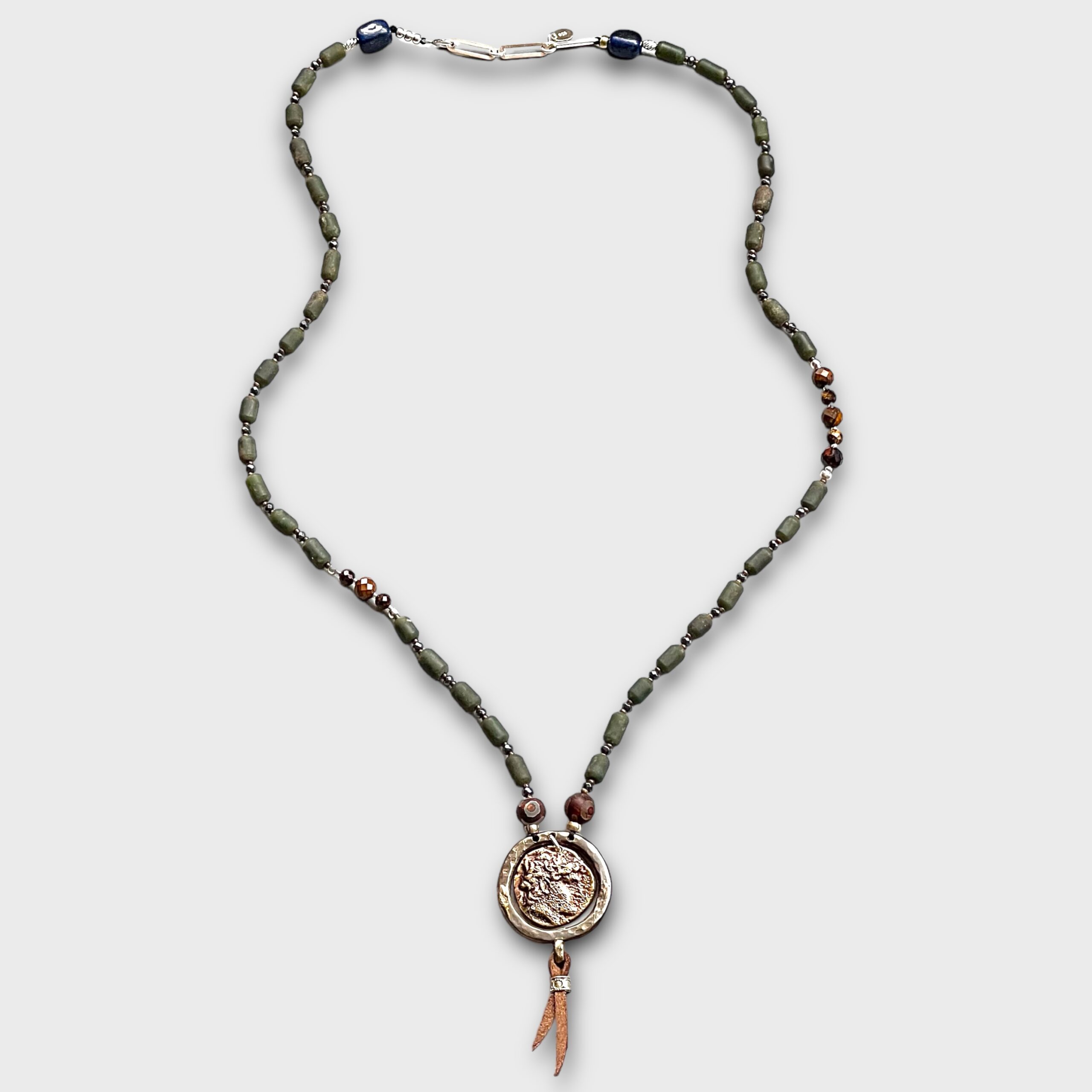 Gümüş, Lapis Lazuli, Jade (Yeşim) taşı, Tiger eye, Hematit, Deri, Bronz, Tibet Akik kullanılarak tasarlanmıştır.