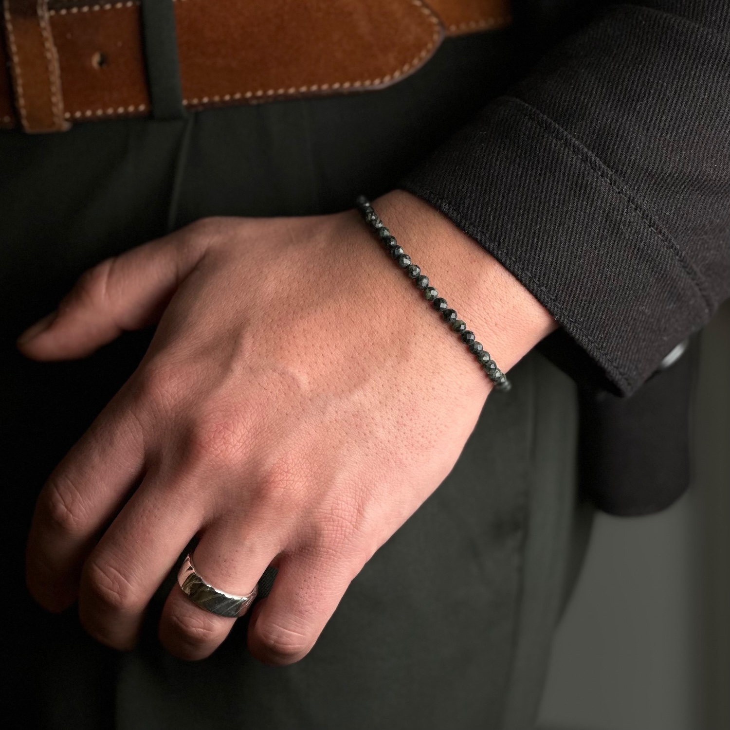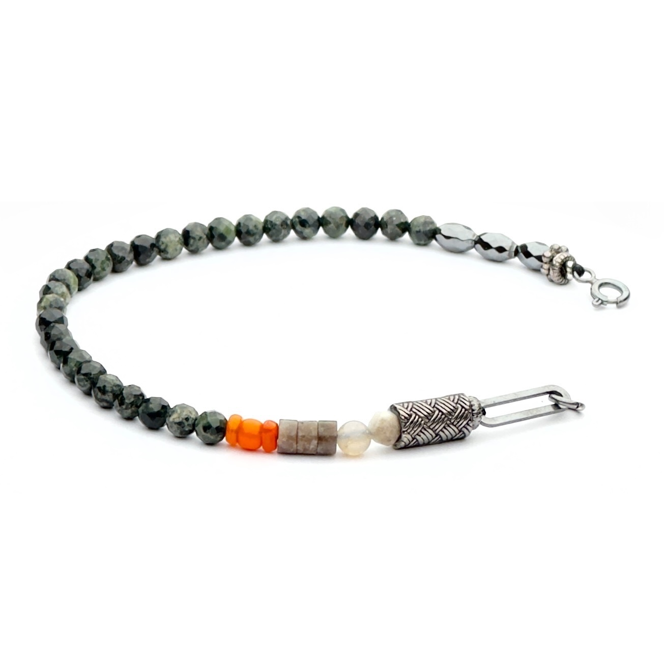 Faset kesim yeşil Yıldız taşı, sedef, akik, amazonit, gümüş kullanılarak tasarlandı.